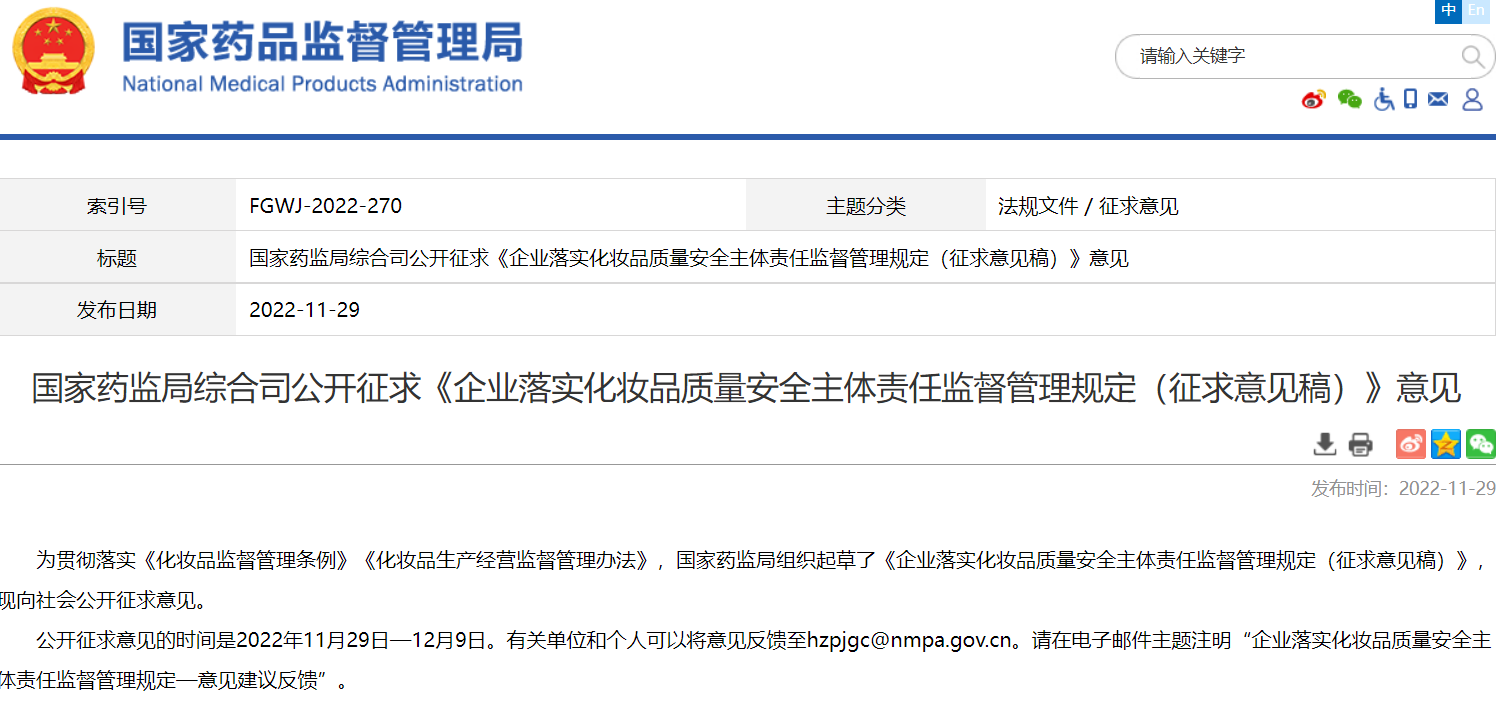 國(guó)家藥監(jiān)局綜合司公開征求《企業(yè)落實(shí)化妝品質(zhì)量安全主體責(zé)任監(jiān)督管理規(guī)定(征求意見稿)》意見