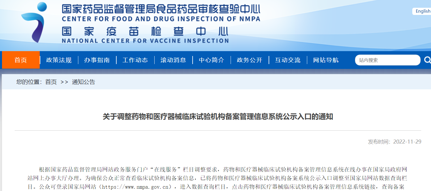 關(guān)于調(diào)整藥物和醫(yī)療器械臨床試驗(yàn)機(jī)構(gòu)備案管理信息系統(tǒng)公示入口的通知