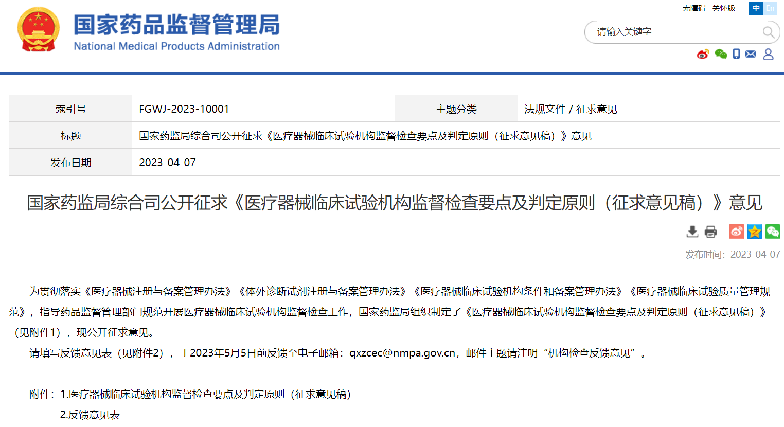 國(guó)家藥監(jiān)局綜合司公開(kāi)征求《醫(yī)療器械臨床試驗(yàn)機(jī)構(gòu)監(jiān)督檢查要點(diǎn)及判定原則(征求意見(jiàn)稿)》意見(jiàn)