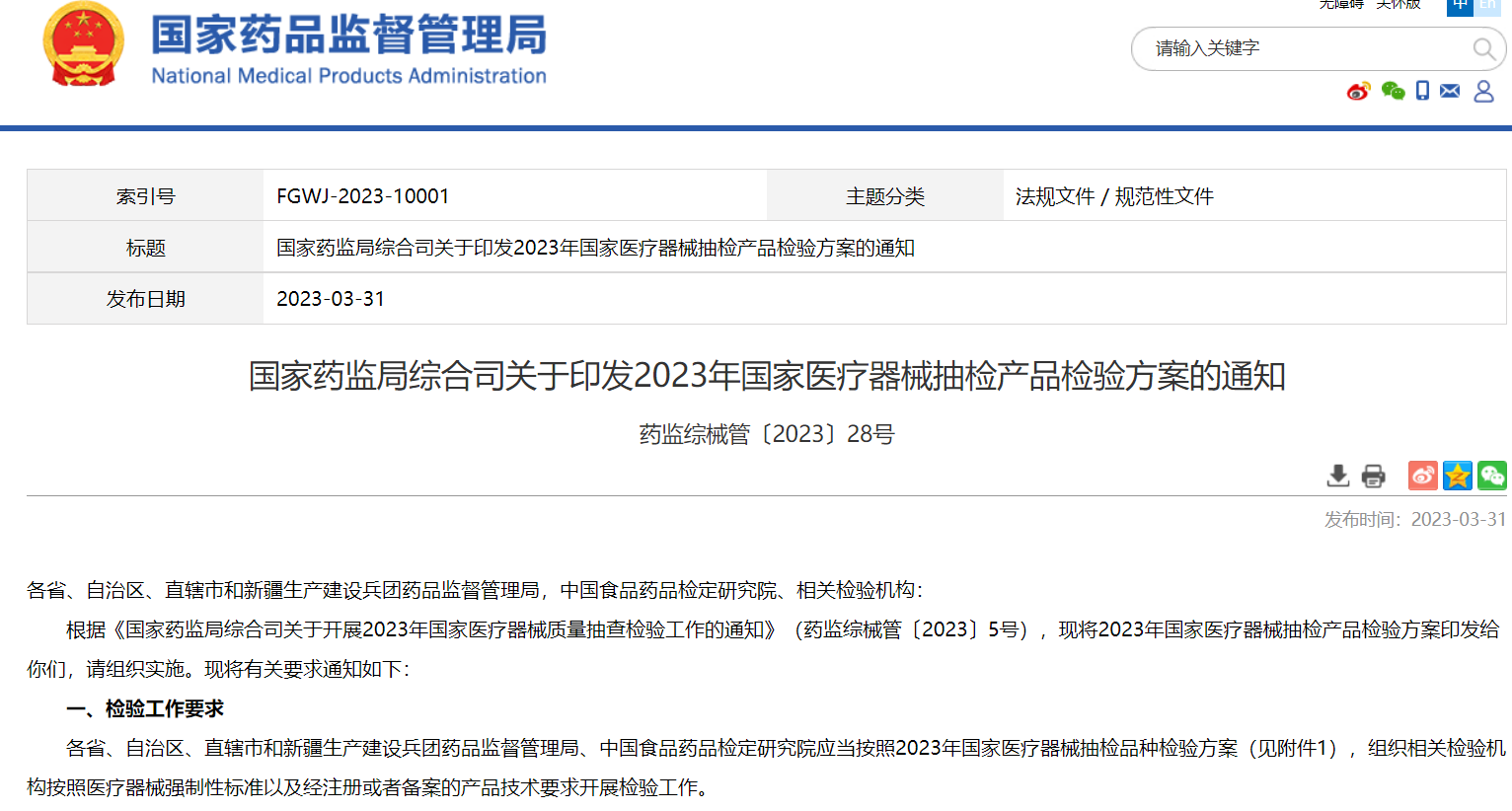 國(guó)家藥監(jiān)局綜合司關(guān)于印發(fā)2023年國(guó)家醫(yī)療器械抽檢產(chǎn)品檢驗(yàn)方案的通知