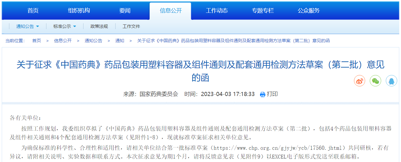 關(guān)于征求《中國(guó)藥典》藥品包裝用塑料容器及組件通則及配套通用檢測(cè)方法草案(第二批)意見(jiàn)的函