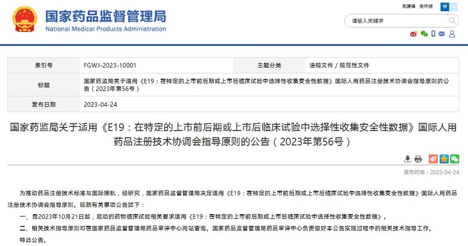 國家藥監(jiān)局關于適用《E19:在特定的上市前后期或上市后臨床試驗中選擇性收集安全性數據》國際人用藥品注冊技術協(xié)調會指導原則的公告(2023年第56號)