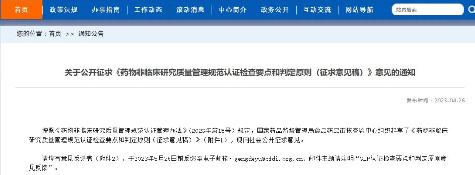 關于公開征求《藥物非臨床研究質量管理規(guī)范認證檢查要點和判定原則(征求意見稿)》意見的通知