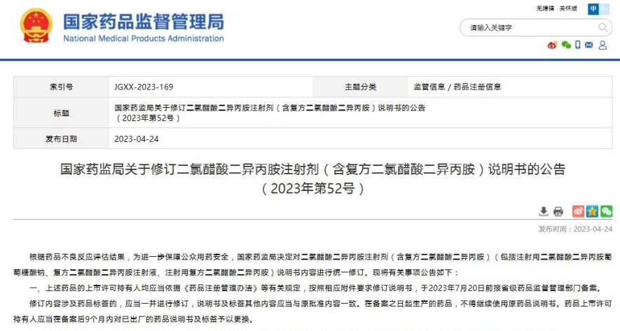 國家藥監(jiān)局關于修訂二氯醋酸二異丙胺注射劑(含復方二氯醋酸二異丙胺)說明書的公告(2023年第52號)
