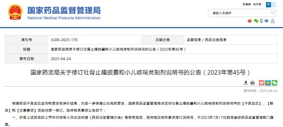 國家藥監(jiān)局關于修訂壯骨止痛膠囊和小兒咳喘靈制劑說明書的公告(2023年第45號)