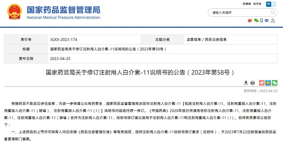 國家藥監(jiān)局關于修訂注射用人白介素-11說明書的公告(2023年第58號)