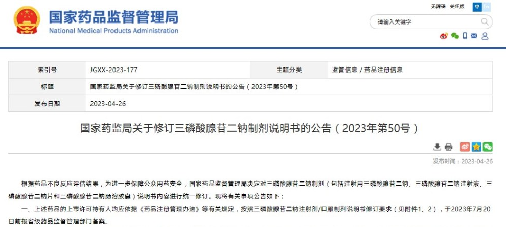 國家藥監(jiān)局關于修訂三磷酸腺苷二鈉制劑說明書的公告(2023年第50號)