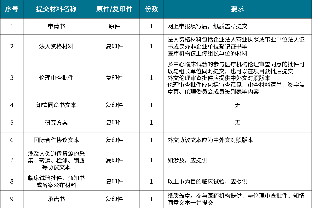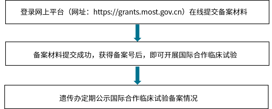 國際合作臨床試驗備案:為獲得相關(guān)藥品和醫(yī)療器械在我國上市許可,在臨床機構(gòu)利用我國人類遺傳資源開展國際合作臨床試驗、不涉及人類遺傳資源材料出境