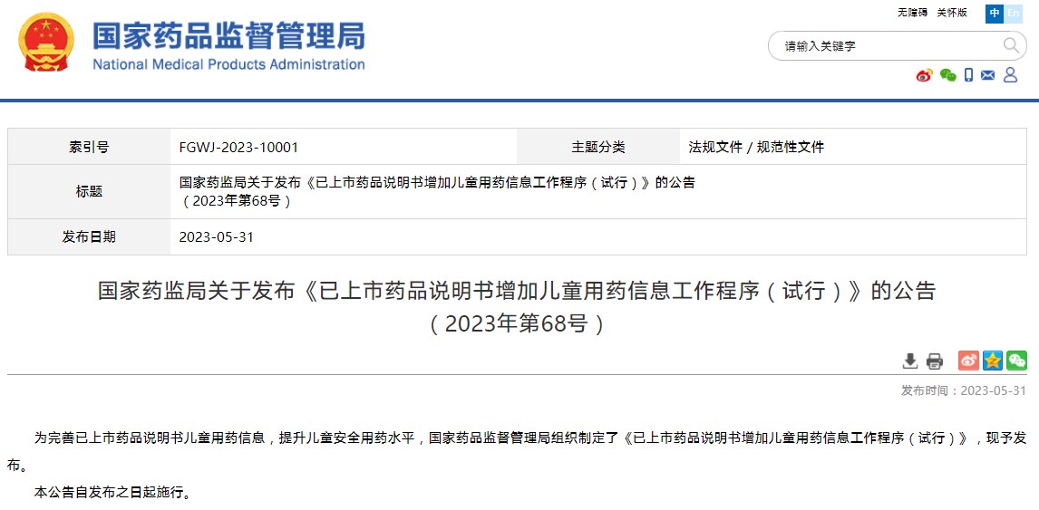國家藥監(jiān)局關于發(fā)布《已上市藥品說明書增加兒童用藥信息工作程序(試行)》的公告(2023年第68號)