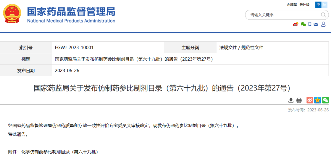 國家藥監(jiān)局關(guān)于發(fā)布仿制藥參比制劑目錄(第六十九批)的通告(2023年第27號)