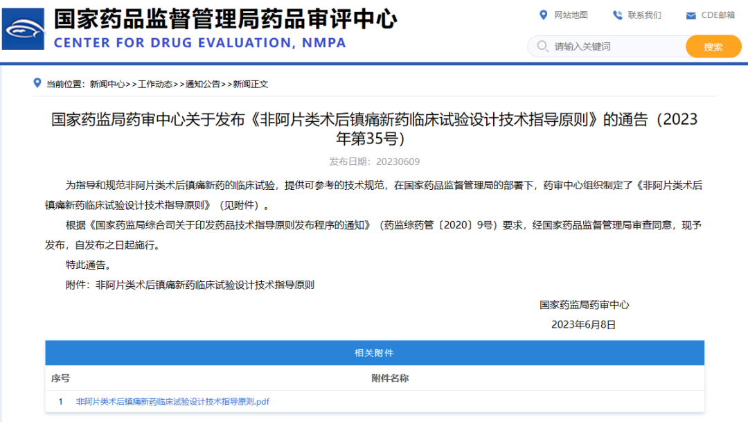 國家藥監(jiān)局藥審中心關(guān)于發(fā)布《非阿片類術(shù)后鎮(zhèn)痛新藥臨床試驗(yàn)設(shè)計(jì)技術(shù)指導(dǎo)原則》的通告(2023年第35號)