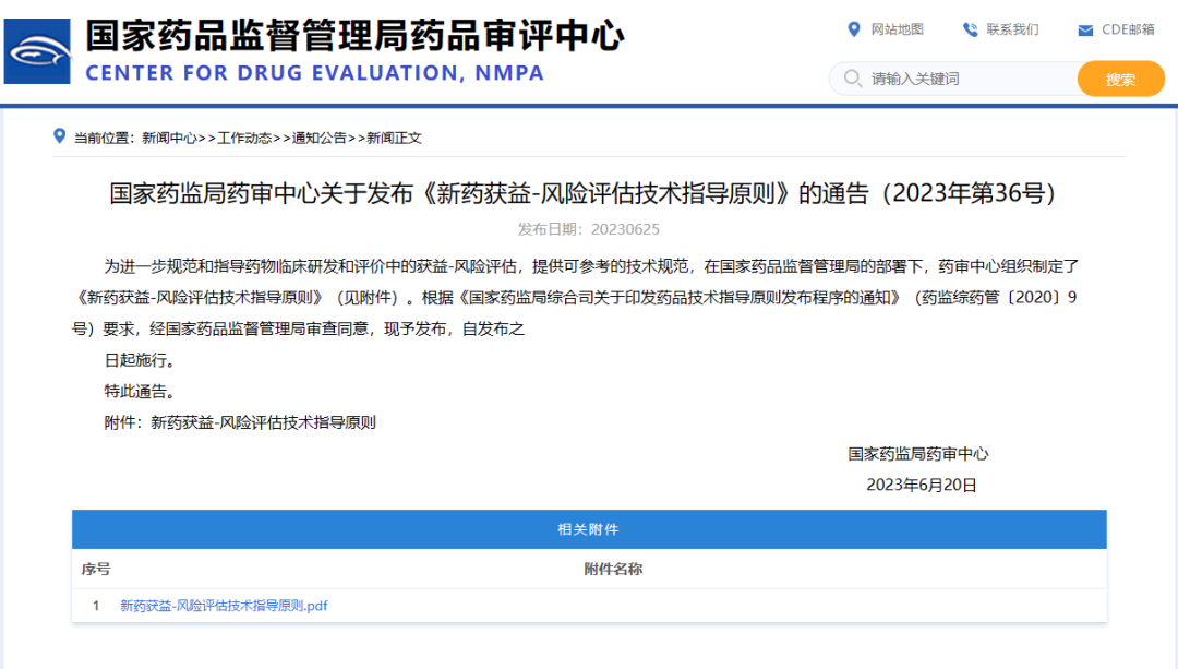 國家藥監(jiān)局藥審中心關(guān)于發(fā)布《新藥獲益-風(fēng)險評估技術(shù)指導(dǎo)原則》的通告(2023年第36號)