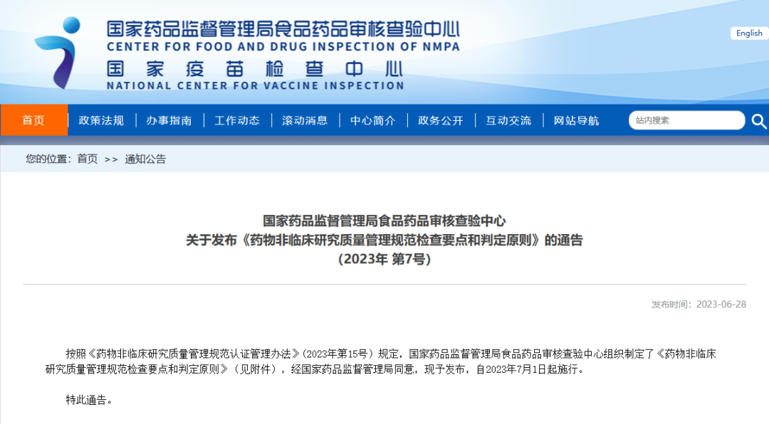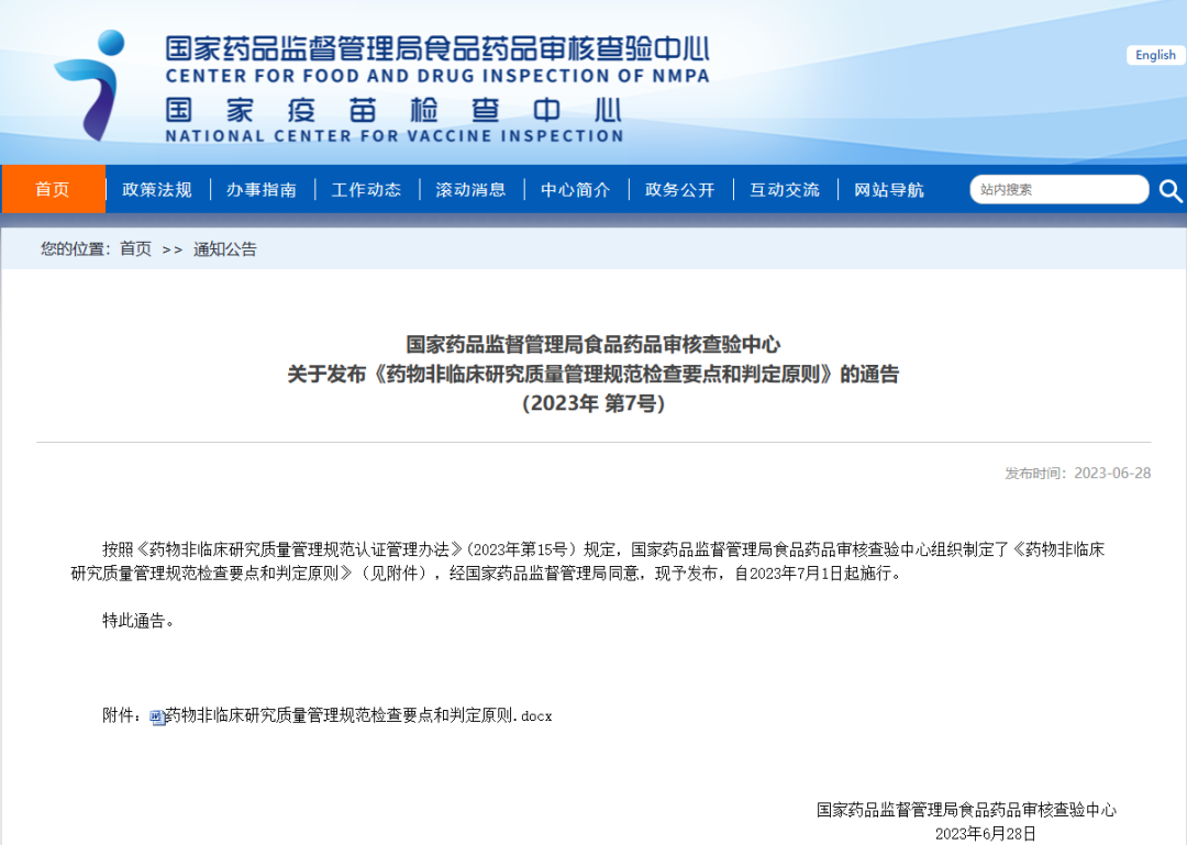 國家藥品監(jiān)督管理局食品藥品審核查驗(yàn)中心關(guān)于發(fā)布《藥物非臨床研究質(zhì)量管理規(guī)范檢查要點(diǎn)和判定原則》的通告(2023年 第7號)