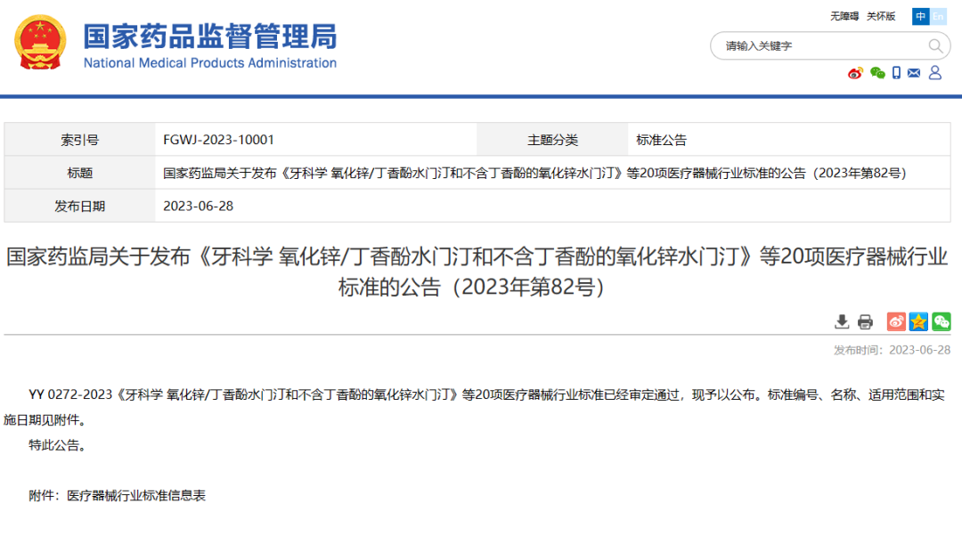 國家藥監(jiān)局關(guān)于發(fā)布《牙科學(xué) 氧化鋅/丁香酚水門汀和不含丁香酚的氧化鋅水門汀》等20項(xiàng)醫(yī)療器械行業(yè)標(biāo)準(zhǔn)的公告(2023年第82號)