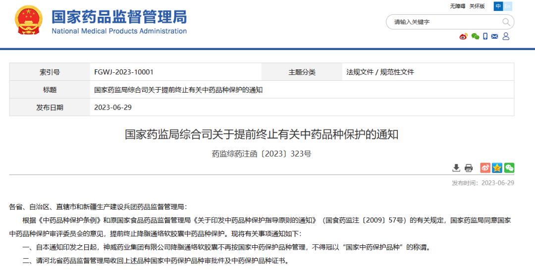 國家藥監(jiān)局綜合司關(guān)于提前終止有關(guān)中藥品種保護(hù)的通知