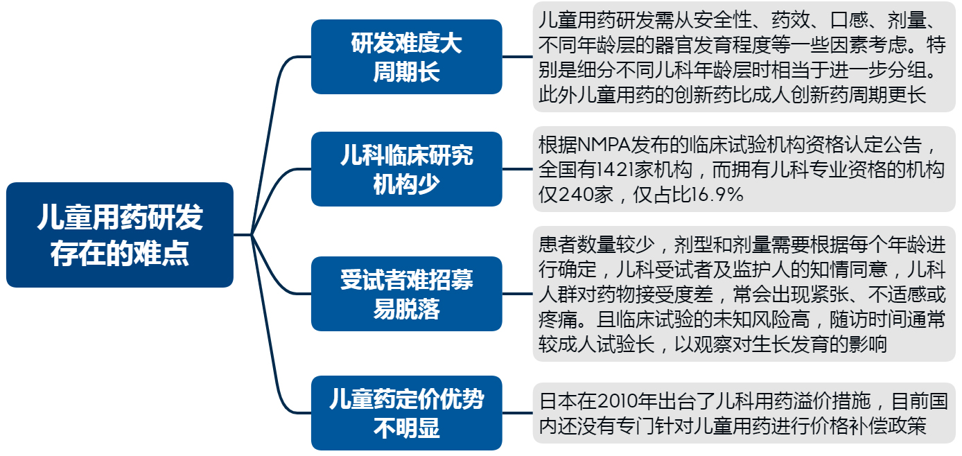 兒童用藥呈現(xiàn)“四少三高”的局面:品種少、劑型少、規(guī)格少、特藥少,用藥風(fēng)險(xiǎn)高、不良反應(yīng)高、資源浪費(fèi)高。造成這個(gè)現(xiàn)狀的原因一是研發(fā)難度大、研發(fā)周期長;二是兒童專業(yè)研發(fā)機(jī)構(gòu)比較少;三是試驗(yàn)受試者難招募、易脫落;四是定價(jià)優(yōu)勢(shì)不明顯,市場推廣難度大。目前國家已經(jīng)推出相應(yīng)政策和指導(dǎo)原則(如技術(shù)端:對(duì)兒童專用藥,自該適應(yīng)癥首次在中國獲批之日起給予6年數(shù)據(jù)保護(hù)期以及12個(gè)月市場獨(dú)占期;審評(píng)審批端:兒童藥優(yōu)先審評(píng)審批并明確為第一優(yōu)先級(jí)別;市場端:放寬醫(yī)療機(jī)構(gòu)兒童藥品“一品兩規(guī)”限制、優(yōu)先納入國家醫(yī)保、國家基本藥物目錄等),以指導(dǎo)和鼓勵(lì)企業(yè)研發(fā)兒童用藥,促進(jìn)或推動(dòng)兒童藥物可及,滿足兒童臨床用藥需求。