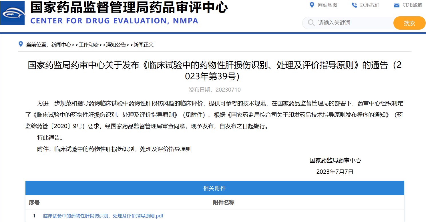 國家藥監(jiān)局藥審中心關(guān)于發(fā)布《臨床試驗(yàn)中的藥物性肝損傷識(shí)別、處理及評(píng)價(jià)指導(dǎo)原則》的通告(2023年第39號(hào))