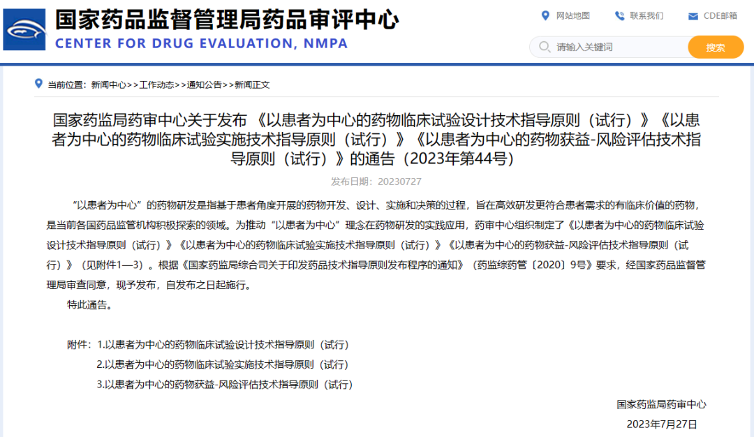 國家藥監(jiān)局藥審中心關(guān)于發(fā)布 《以患者為中心的藥物臨床試驗(yàn)設(shè)計(jì)技術(shù)指導(dǎo)原則(試行)》《以患者為中心的藥物臨床試驗(yàn)實(shí)施技術(shù)指導(dǎo)原則(試行)》《以患者為中心的藥物獲益-風(fēng)險(xiǎn)評估技術(shù)指導(dǎo)原則(試行)》的通告(2023年第44號)