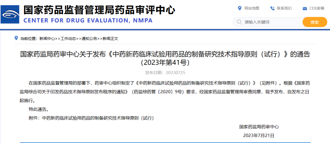 國家藥監(jiān)局藥審中心關(guān)于發(fā)布《中藥新藥臨床試驗(yàn)用藥品的制備研究技術(shù)指導(dǎo)原則(試行)》的通告(2023年第41號)