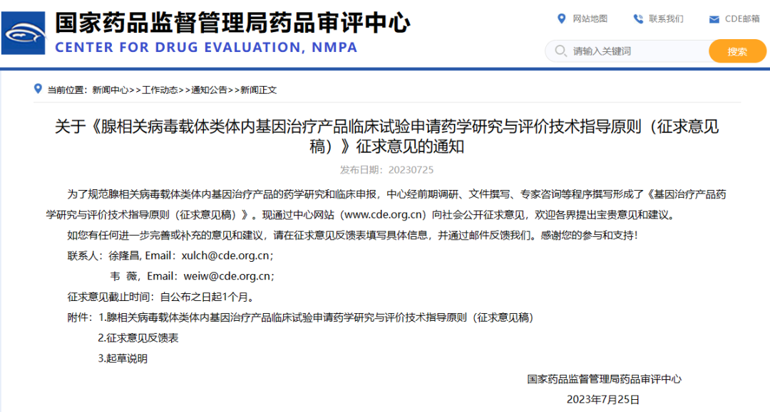 關(guān)于《腺相關(guān)病毒載體類體內(nèi)基因治療產(chǎn)品臨床試驗(yàn)申請藥學(xué)研究與評價(jià)技術(shù)指導(dǎo)原則(征求意見稿)》征求意見的通知