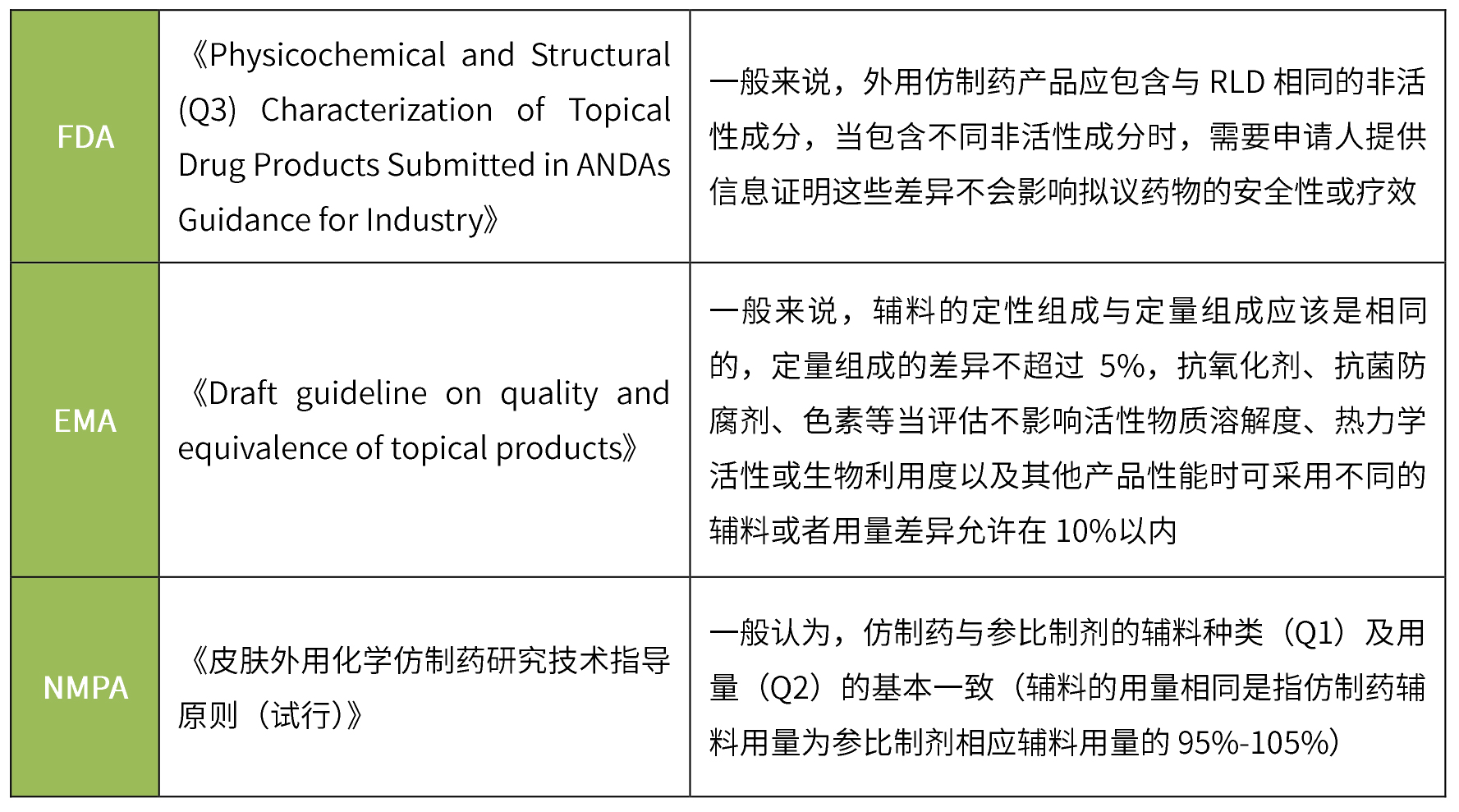 透皮制劑仿制藥一般要求與參比制劑的輔料種類及用量一致,無論FDA、EMA還是NMPA,在對處方組成的要求上大同小異,均要求輔料種類一致、用量基本相同。