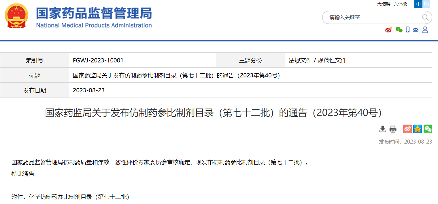 國(guó)家藥監(jiān)局關(guān)于發(fā)布仿制藥參比制劑目錄(第七十二批)的通告(2023年第40號(hào))