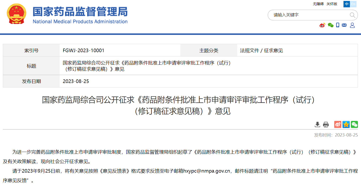 國(guó)家藥監(jiān)局綜合司公開(kāi)征求《藥品附條件批準(zhǔn)上市申請(qǐng)審評(píng)審批工作程序(試行)(修訂稿征求意見(jiàn)稿)》意見(jiàn)