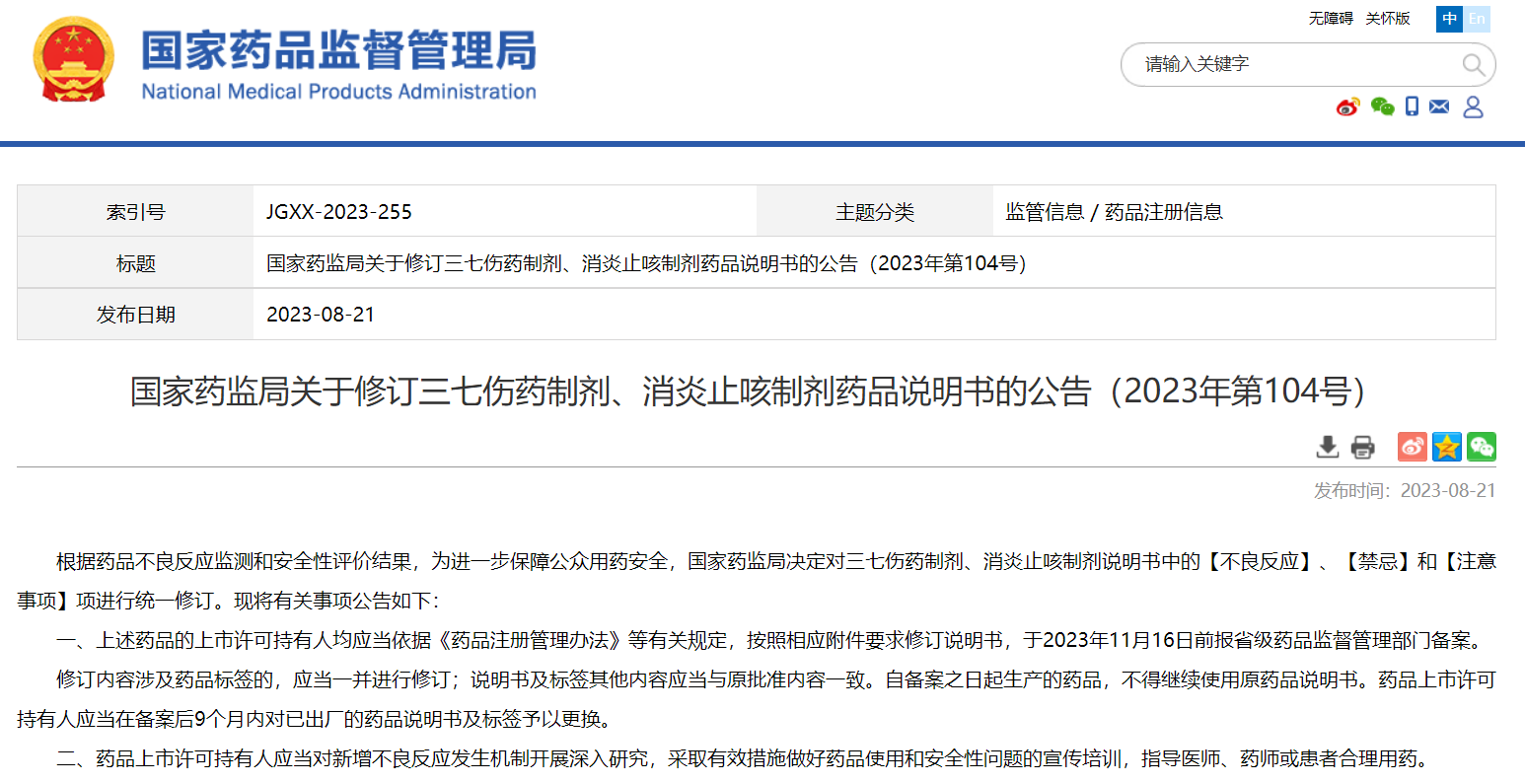 國(guó)家藥監(jiān)局關(guān)于修訂三七傷藥制劑、消炎止咳制劑藥品說(shuō)明書(shū)的公告(2023年第104號(hào))