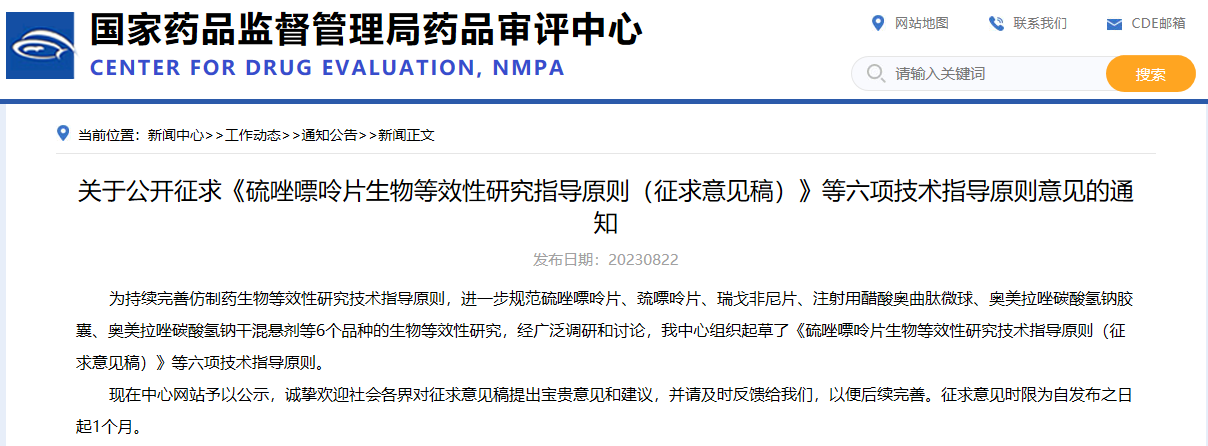 關(guān)于公開(kāi)征求《硫唑嘌呤片生物等效性研究指導(dǎo)原則(征求意見(jiàn)稿)》等六項(xiàng)技術(shù)指導(dǎo)原則意見(jiàn)的通知