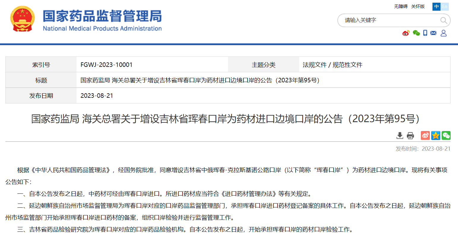 國(guó)家藥監(jiān)局海關(guān)總署關(guān)于增設(shè)吉林省琿春口岸為藥材進(jìn)口邊境口岸的公告(2023年第95號(hào))