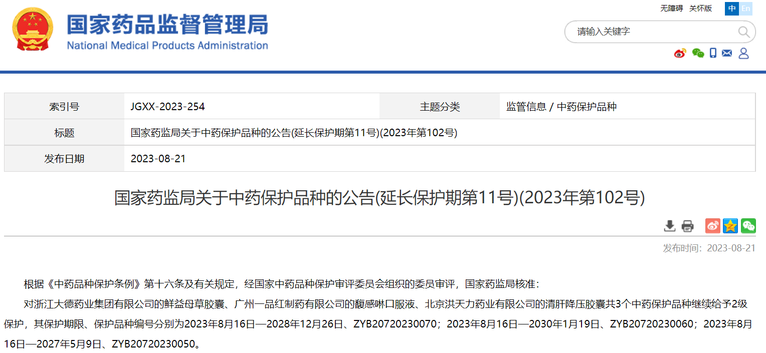 國(guó)家藥監(jiān)局關(guān)于中藥保護(hù)品種的公告(延長(zhǎng)保護(hù)期第11號(hào))(2023年第102號(hào))