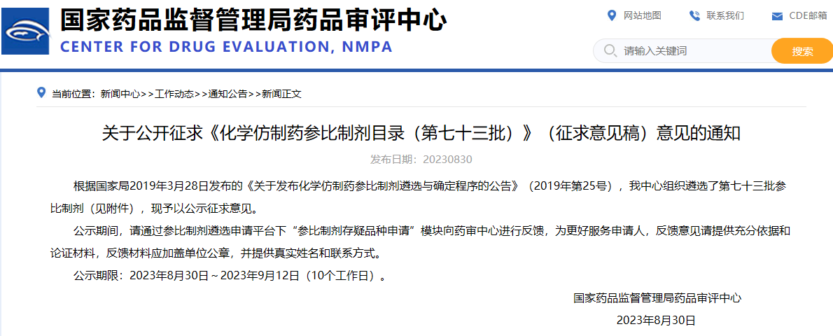 關(guān)于公開征求《化學(xué)仿制藥參比制劑目錄(第七十三批)》(征求意見稿)意見的通知
