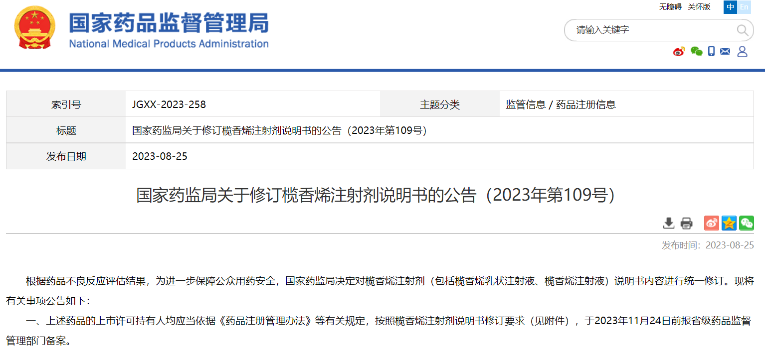 國家藥監(jiān)局關(guān)于修訂欖香烯注射劑說明書的公告(2023年第109號)
