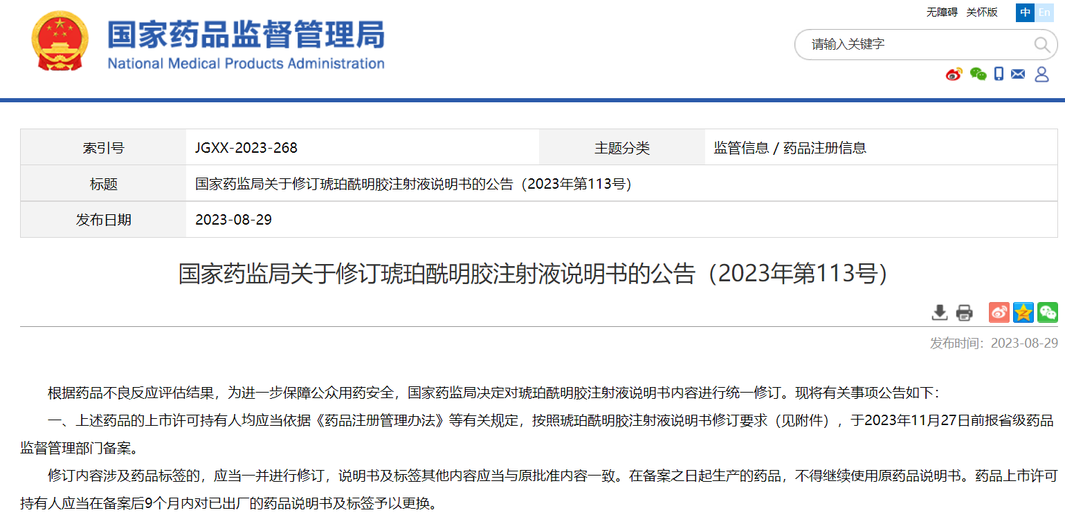 國家藥監(jiān)局關(guān)于修訂琥珀酰明膠注射液說明書的公告(2023年第113號)