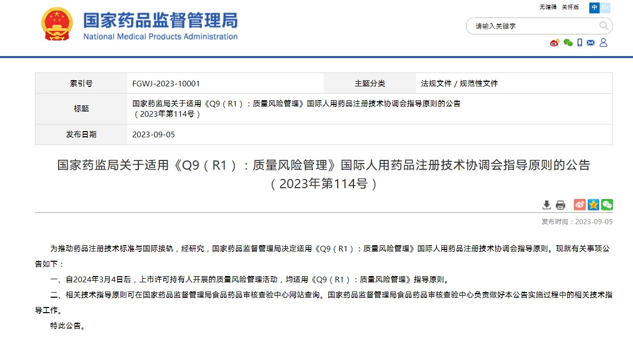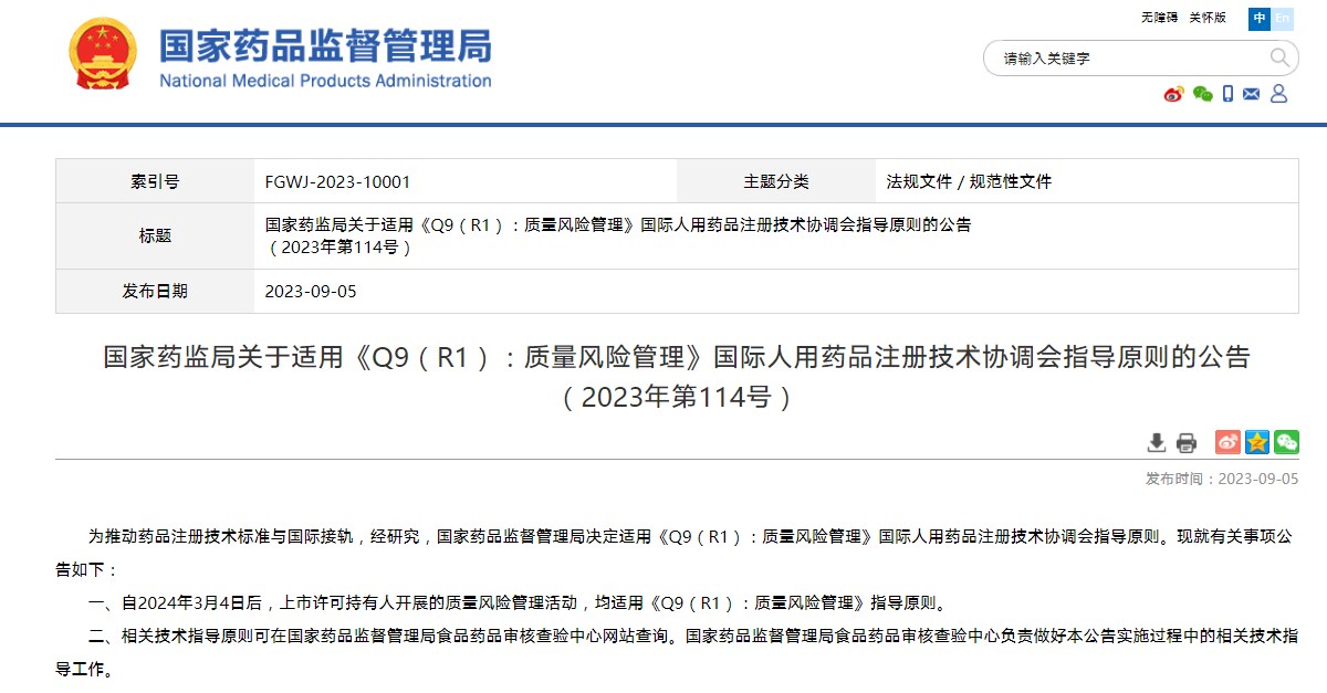 國家藥監(jiān)局關(guān)于適用《Q9(R1):質(zhì)量風(fēng)險(xiǎn)管理》國際人用藥品注冊技術(shù)協(xié)調(diào)會指導(dǎo)原則的公告(2023年第114號)