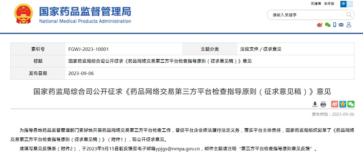 國家藥監(jiān)局綜合司公開征求《藥品網(wǎng)絡(luò)交易第三方平臺檢查指導(dǎo)原則(征求意見稿)》意見