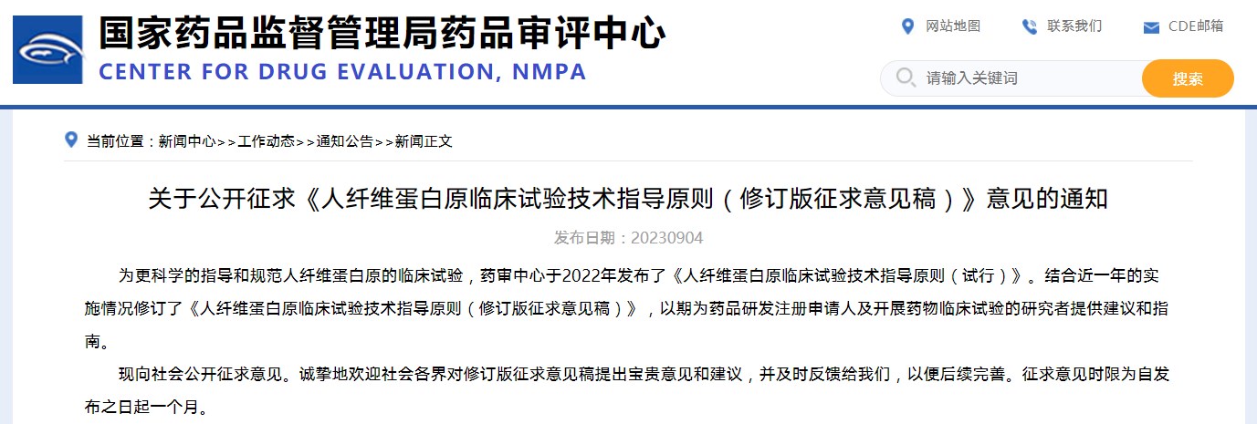 關(guān)于公開征求《人纖維蛋白原臨床試驗(yàn)技術(shù)指導(dǎo)原則(修訂版征求意見稿)》意見的通知