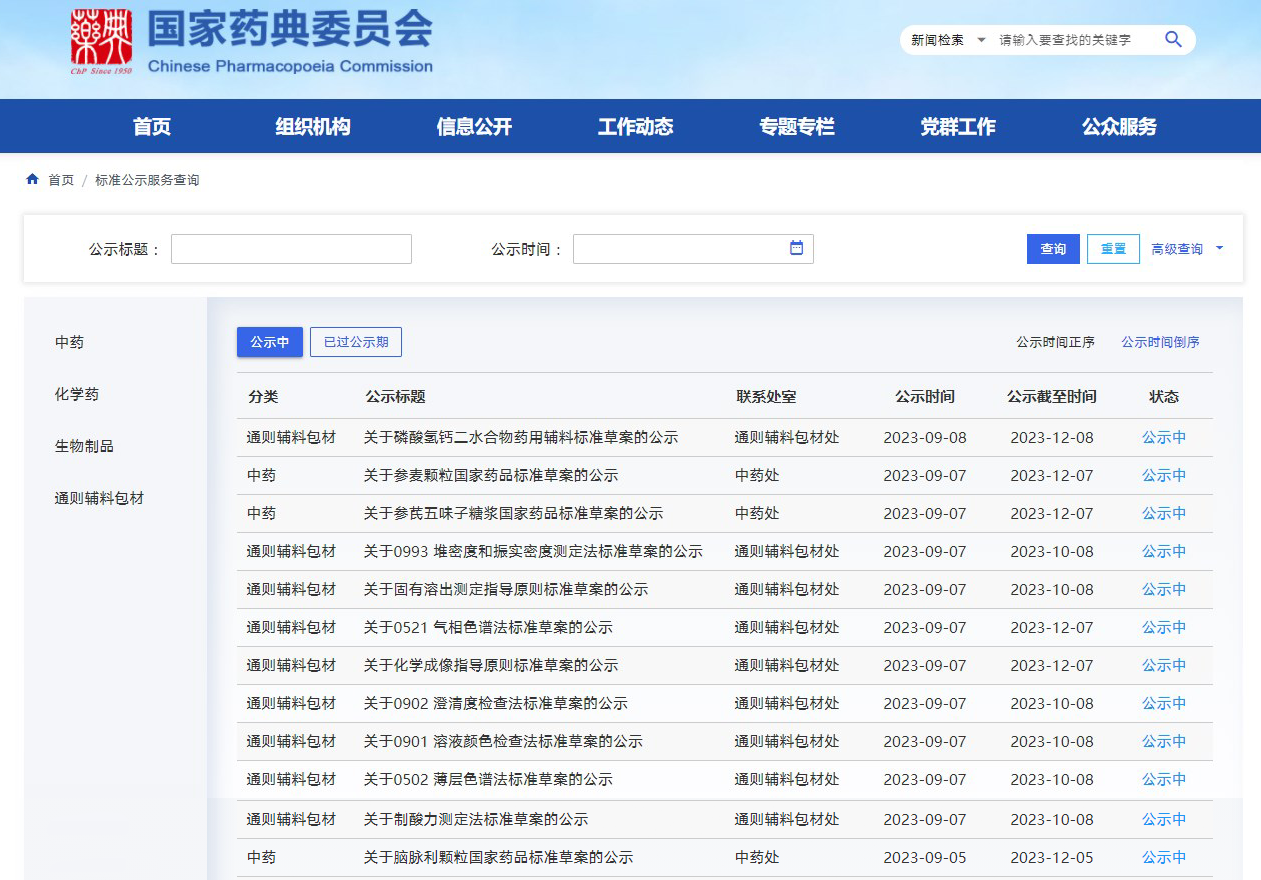近期藥典委發(fā)布關(guān)于腦脈利顆粒、參芪五味子糖漿、參麥顆粒 國家藥品標(biāo)準(zhǔn)草案,關(guān)于磷酸氫鈣二水合物國家藥用輔料標(biāo)準(zhǔn)草案,關(guān)于制酸力測定法、0502 薄層色譜法、0901 溶液顏色檢查法、0902 澄清度檢查法、0521 氣相色譜法、0993 堆密度和振實(shí)密度測定法標(biāo)準(zhǔn)草案,關(guān)于化學(xué)成像、固有溶出測定指導(dǎo)原則標(biāo)準(zhǔn)草案的公示。