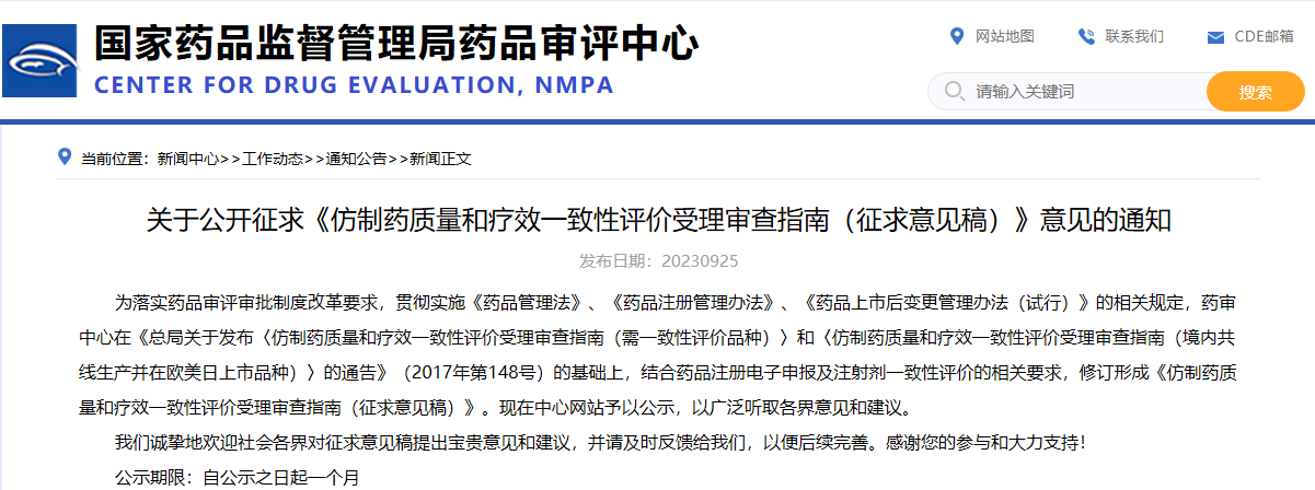 關(guān)于公開征求《仿制藥質(zhì)量和療效一致性評價(jià)受理審查指南(征求意見稿)》意見的通知