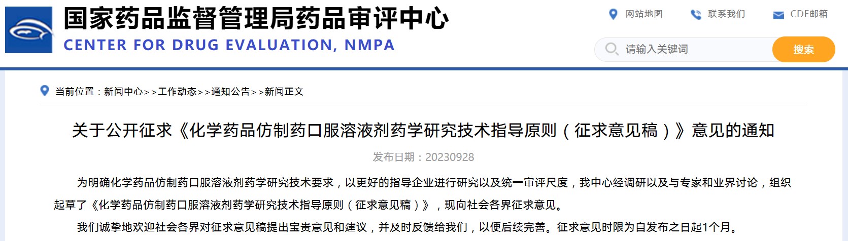 關(guān)于公開征求《化學藥品仿制藥口服溶液劑藥學研究技術(shù)指導原則》意見的通知