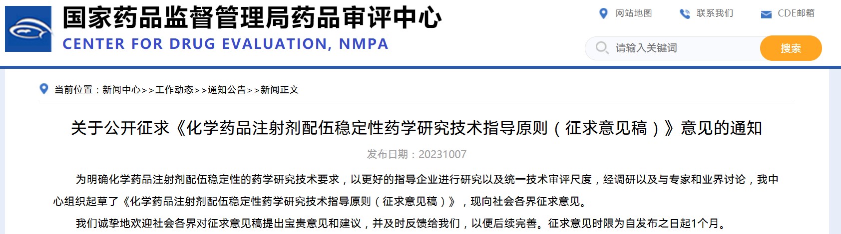關(guān)于公開征求《化學藥品注射劑配伍穩(wěn)定性藥學研究技術(shù)指導原則》意見的通知