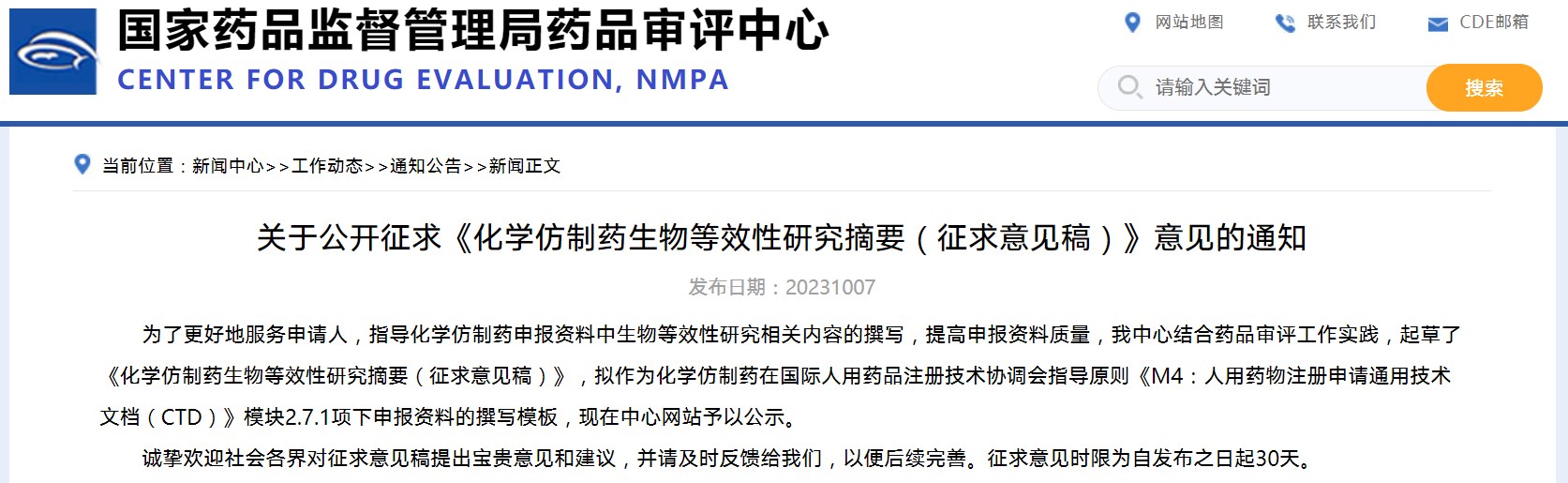 關(guān)于公開征求《化學仿制藥生物等效性研究摘要》意見的通知