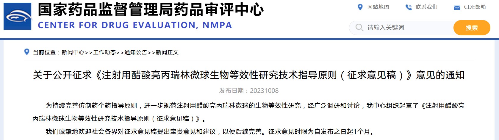 關(guān)于公開征求《注射用醋酸亮丙瑞林微球生物等效性研究技術(shù)指導原則(征求意見稿)》意見的通知