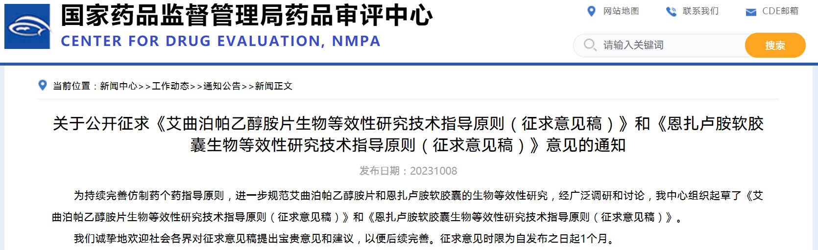關(guān)于公開征求《艾曲泊帕乙醇胺片生物等效性研究技術(shù)指導原則(征求意見稿)》和《恩扎盧胺軟膠囊生物等效性研究技術(shù)指導原則(征求意見稿)》意見的通知