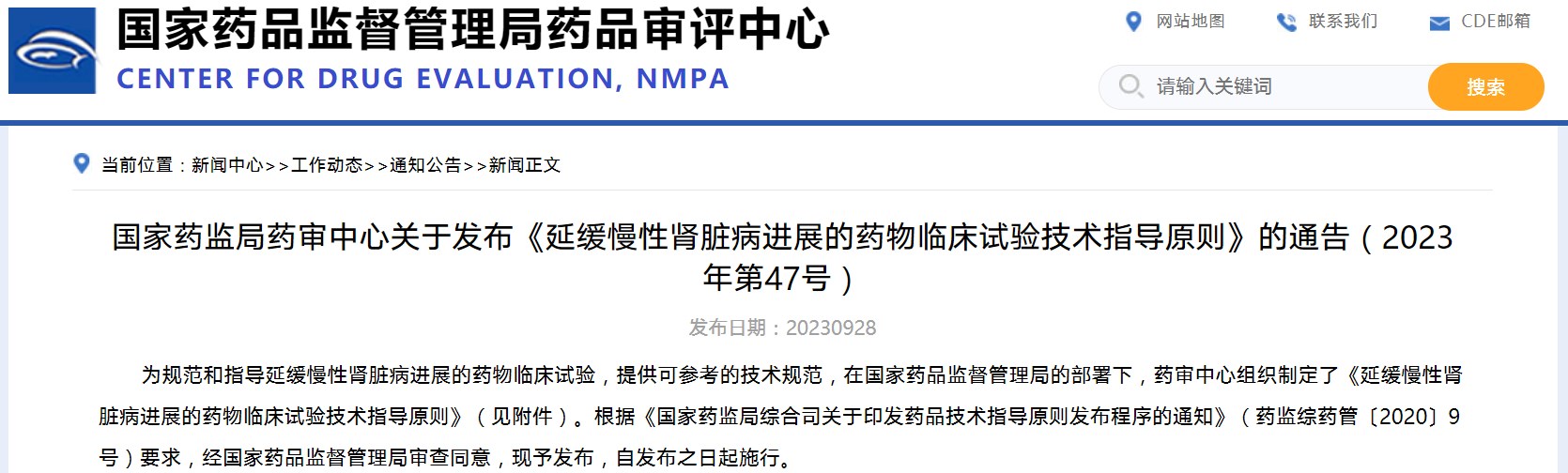 國家藥監(jiān)局藥審中心關(guān)于發(fā)布《延緩慢性腎臟病進展的藥物臨床試驗技術(shù)指導原則》的通告(2023年第47號)