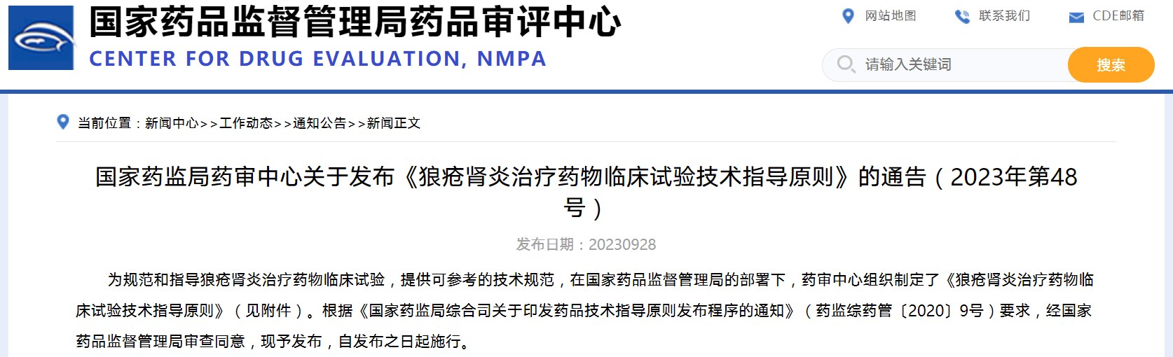 國家藥監(jiān)局藥審中心關(guān)于發(fā)布《狼瘡腎炎治療藥物臨床試驗技術(shù)指導原則》的通告(2023年第48號)