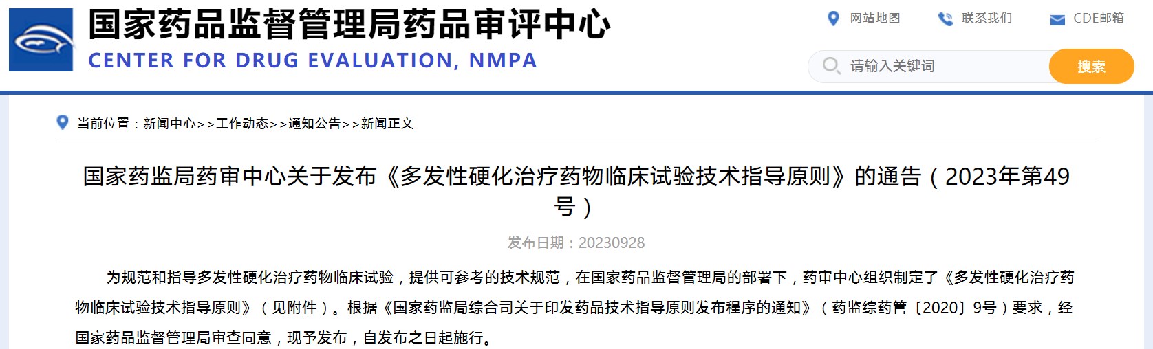 國家藥監(jiān)局藥審中心關(guān)于發(fā)布《多發(fā)性硬化治療藥物臨床試驗技術(shù)指導原則》的通告(2023年第49號)