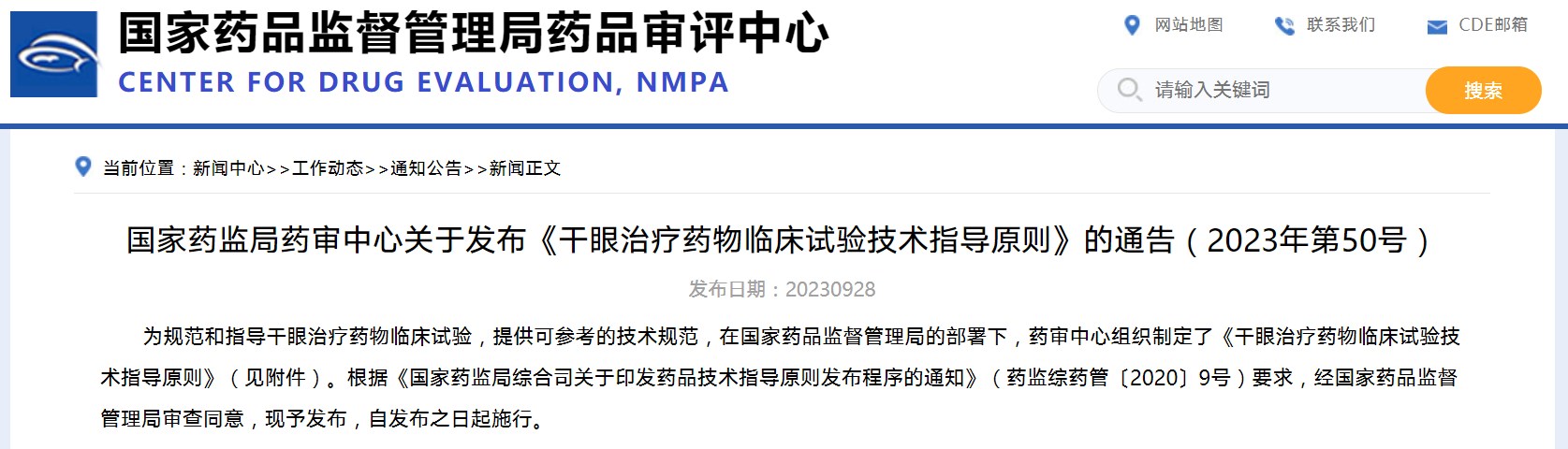 國家藥監(jiān)局藥審中心關(guān)于發(fā)布《干眼治療藥物臨床試驗技術(shù)指導原則》的通告(2023年第50號)