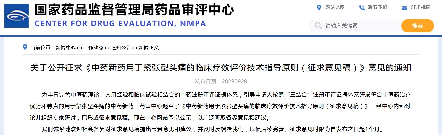 關(guān)于公開征求《中藥新藥用于緊張型頭痛的臨床療效評價技術(shù)指導原則(征求意見稿)》意見的通知