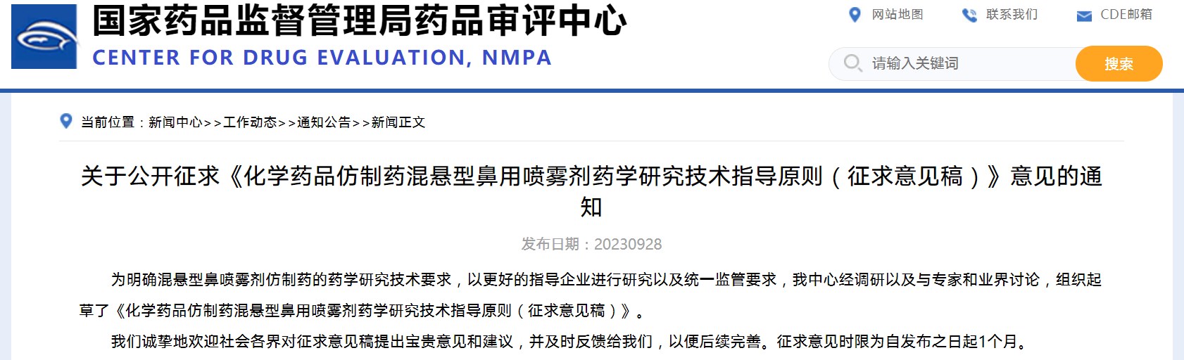 關(guān)于公開征求《化學藥品仿制藥混懸型鼻用噴霧劑藥學研究技術(shù)指導原則(征求意見稿)》意見的通知